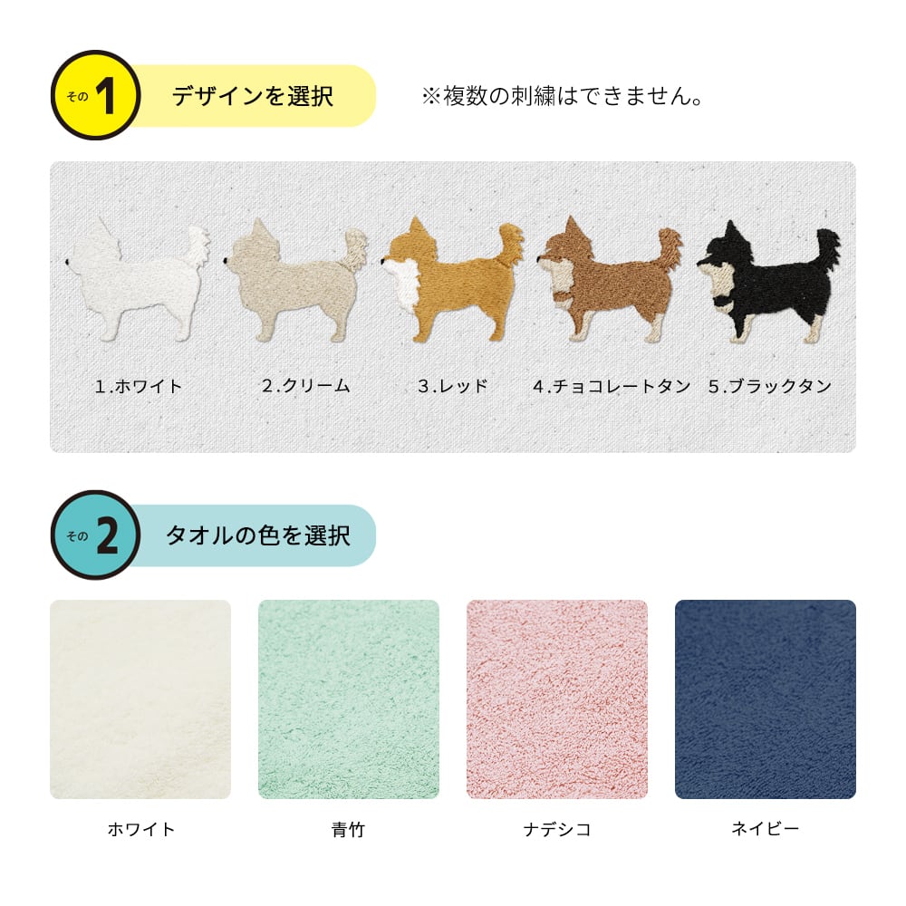 今治ブランド認定のフェイスタオルにチワワのワンポイント刺繍を施しました。